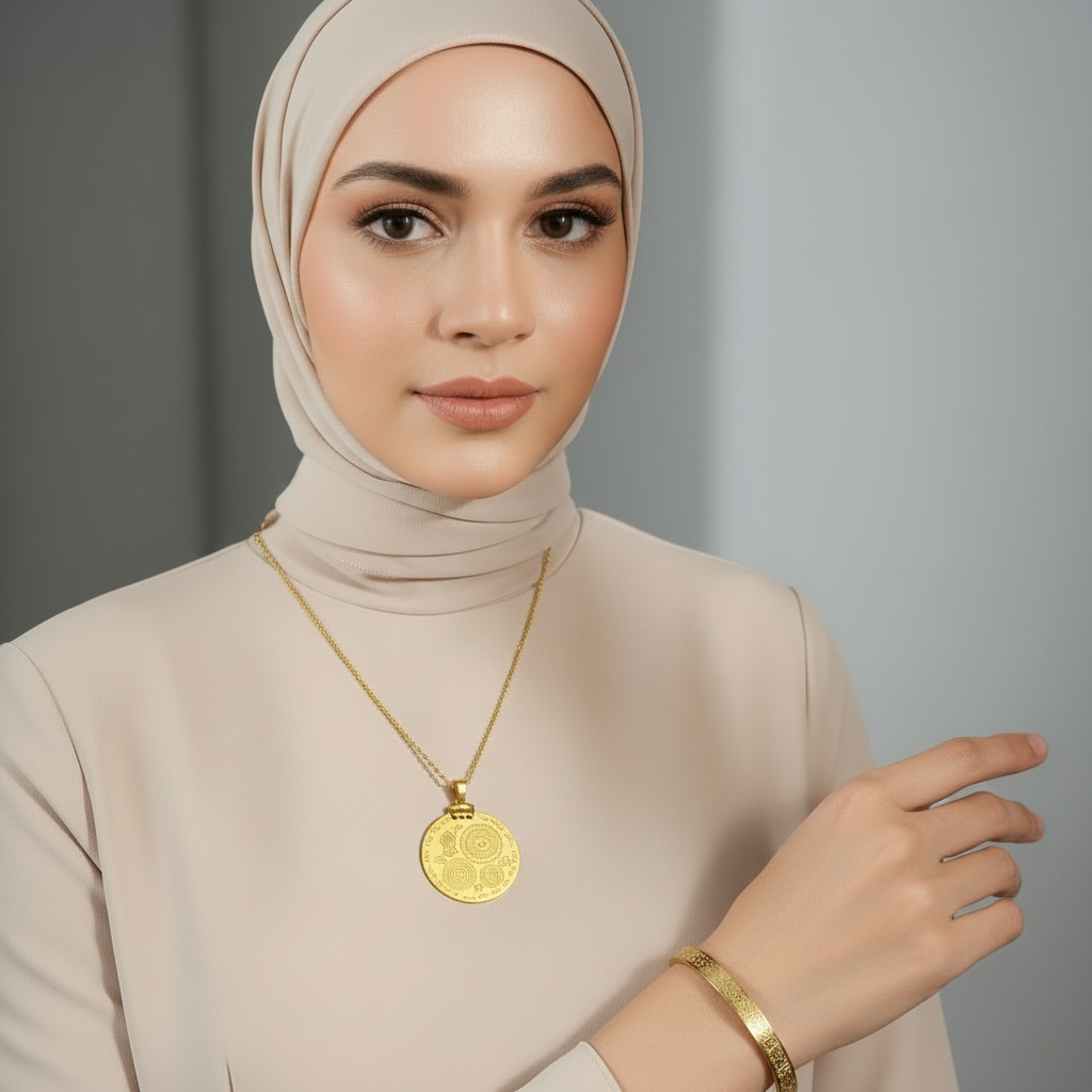 Birden fazla motifin yer aldığı kolye ile Ayetel Kürsi bileklikten oluşan bu set modern ve dikkat çekici bir tasarıma sahiptir.
