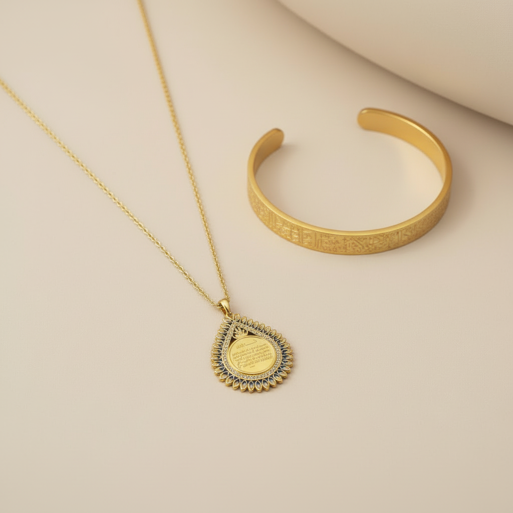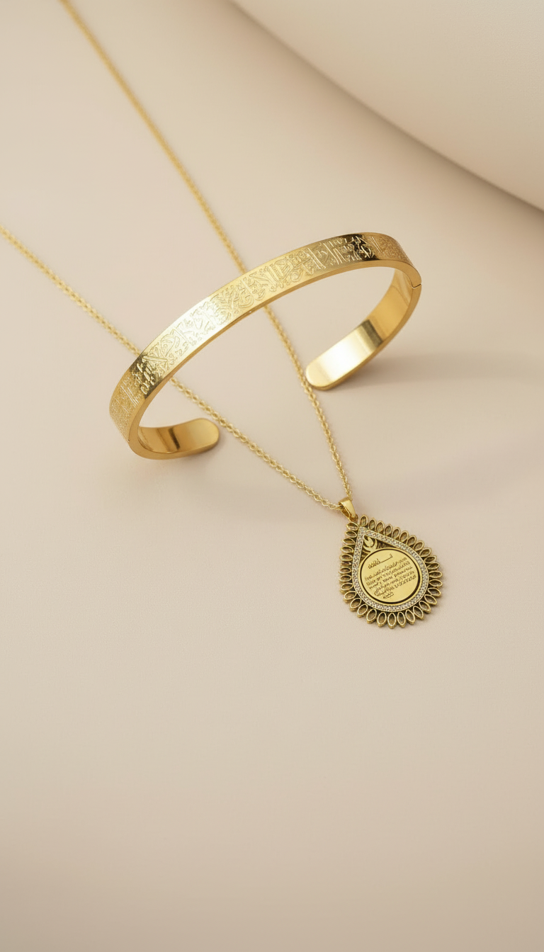 Damla formundaki kolye ile Ayetel Kürsi bileklikten oluşan bu zarif set hem günlük hem özel günlerde kullanılabilir.
