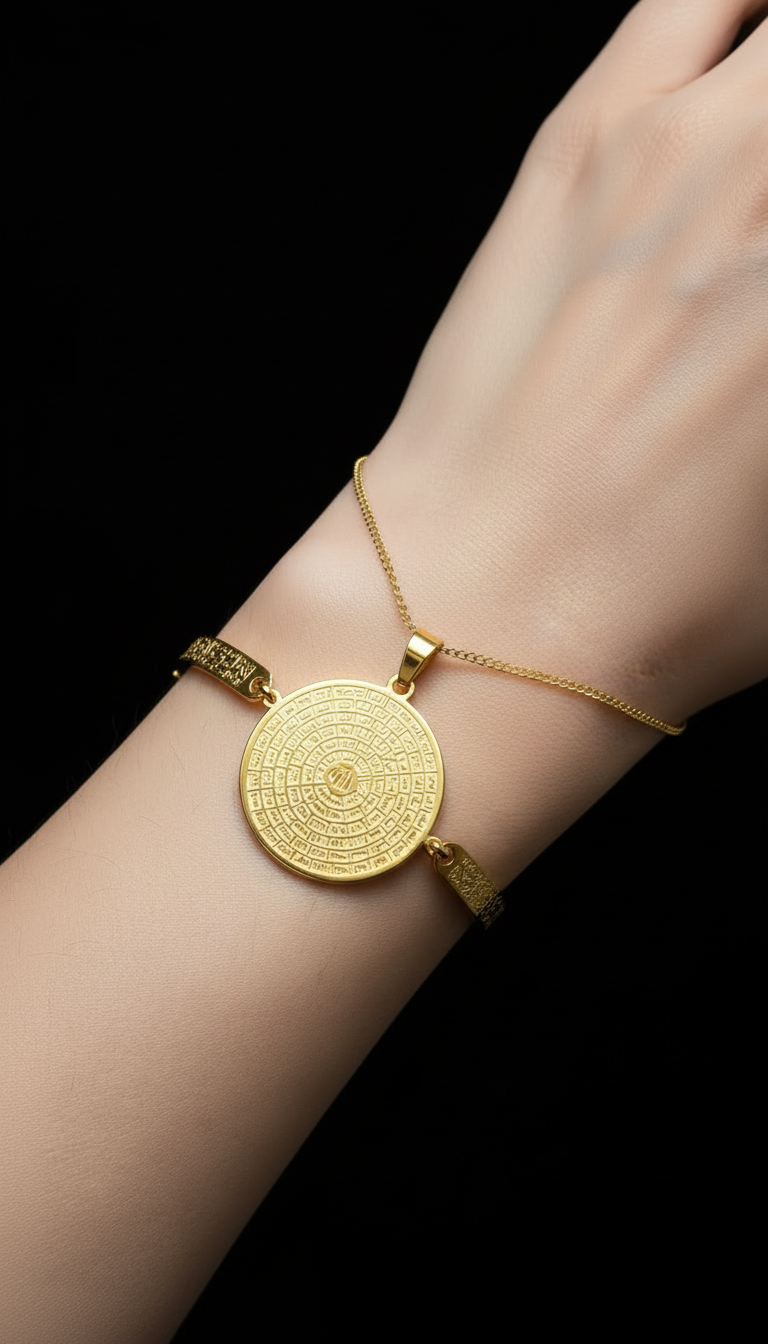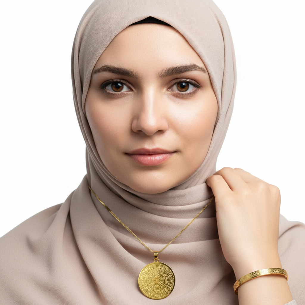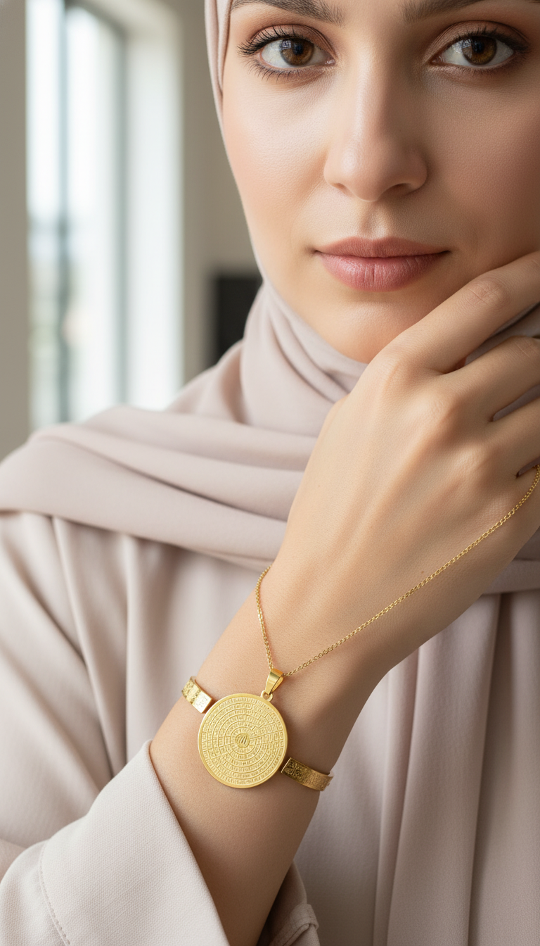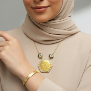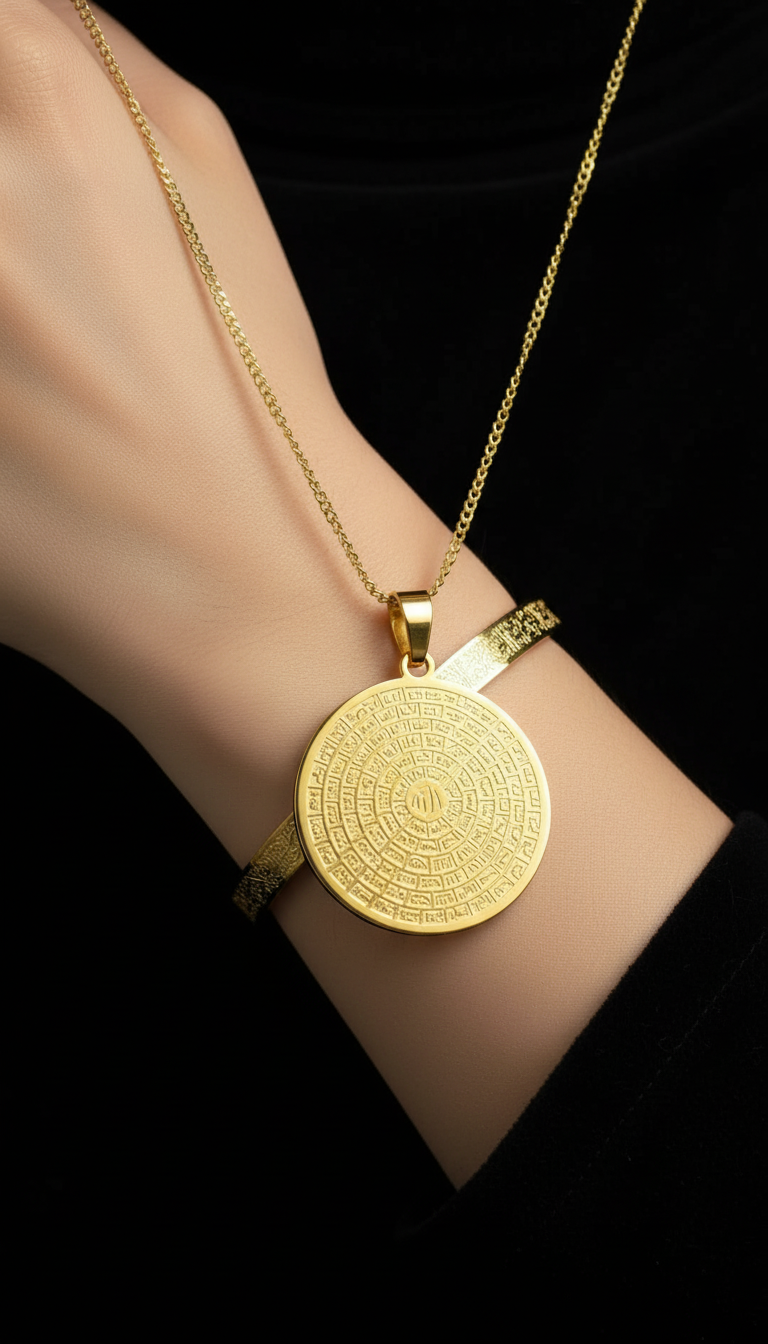 Esmaül Hüsna motifli kolye ve Ayetel Kürsi bileklikten oluşan bu set anlamlı ve zarif bir tasarıma sahiptir.