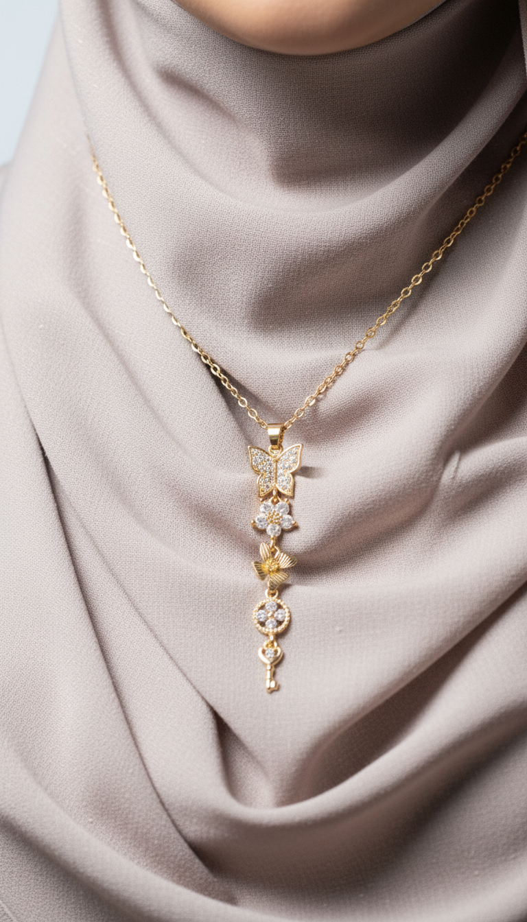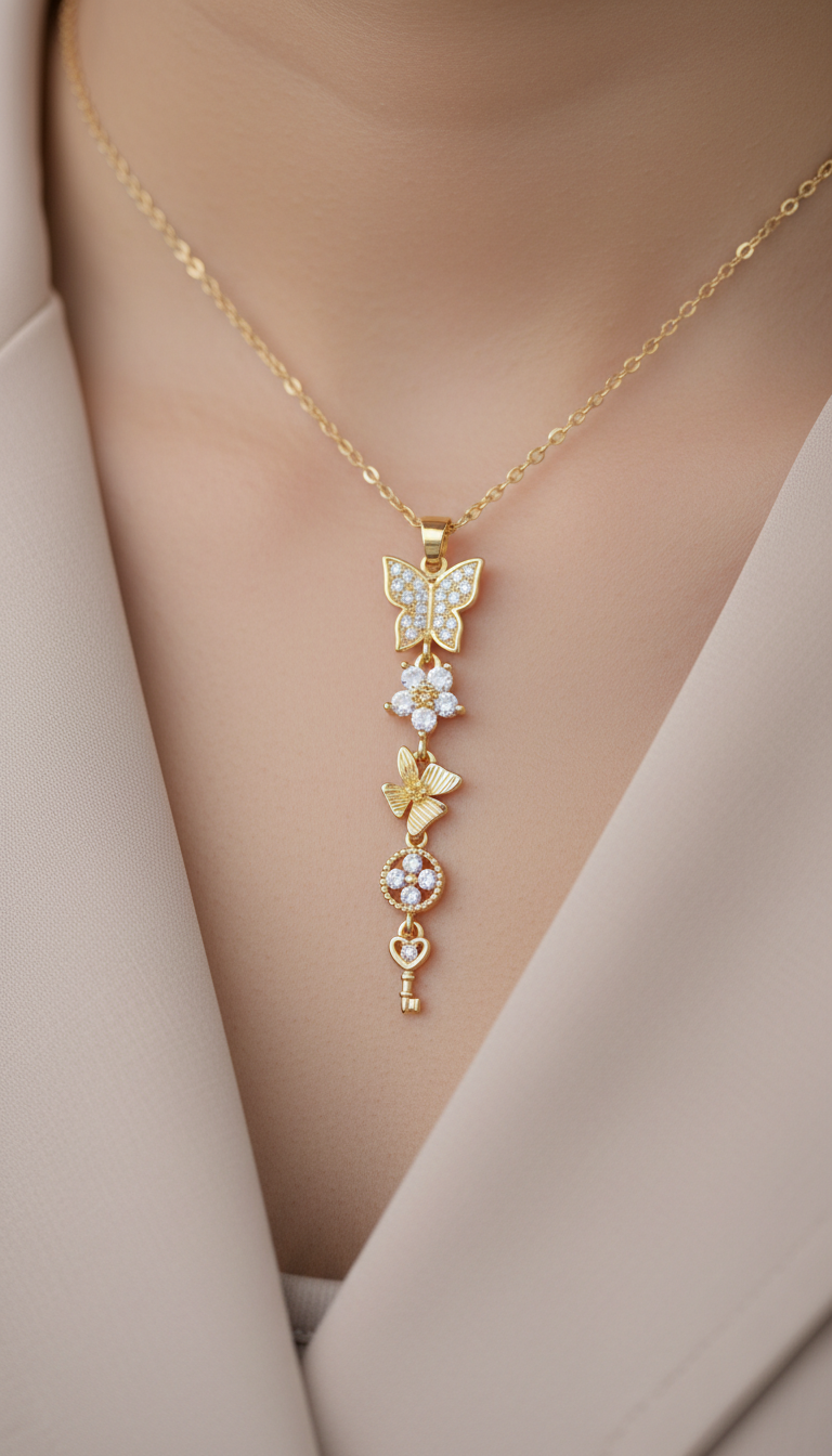 Kelebekli çiçekli anahtarlı Y kolye