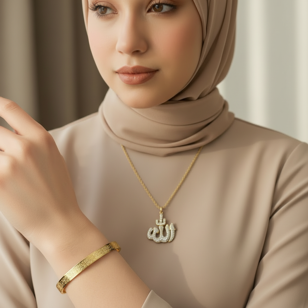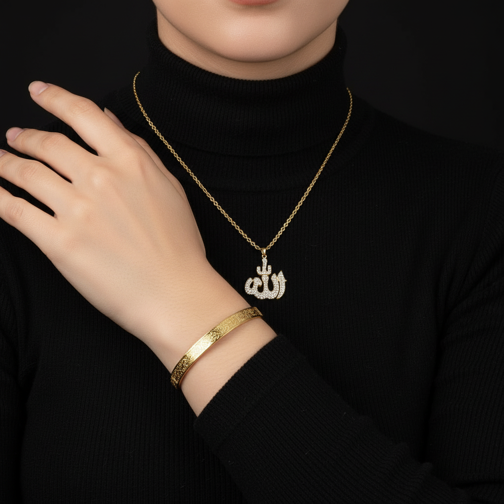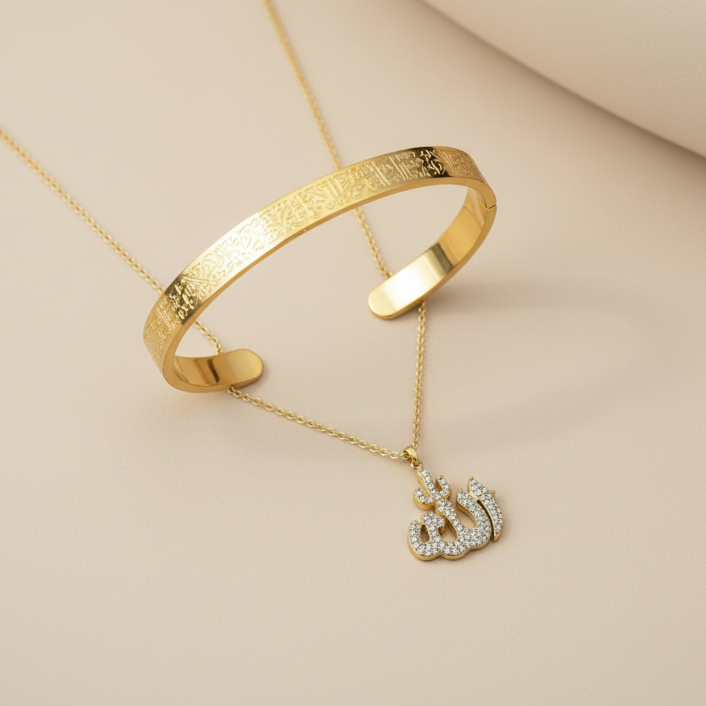 Sade ve şık tasarıma sahip Allah yazılı kolye ile Ayetel Kürsi bileklikten oluşan bu set minimal takı severler için idealdir.