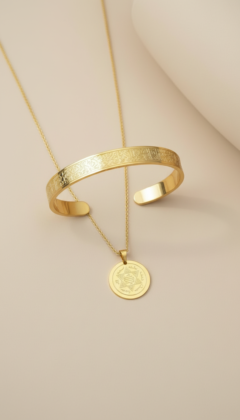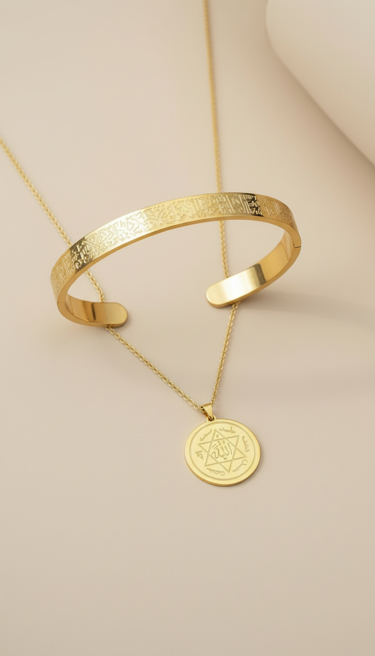 Şık ve anlamlı tasarımıyla Süleyman mührü kolye ve Ayetel Kürsi bileklikten oluşan bu özel set, manevi değeri yüksek bir aksesuardır. Paslanmaz çelikten üretilmiş olup uzun süre kararma yapmadan kullanılabilir. Günlük kullanım ve özel günler için idealdir.