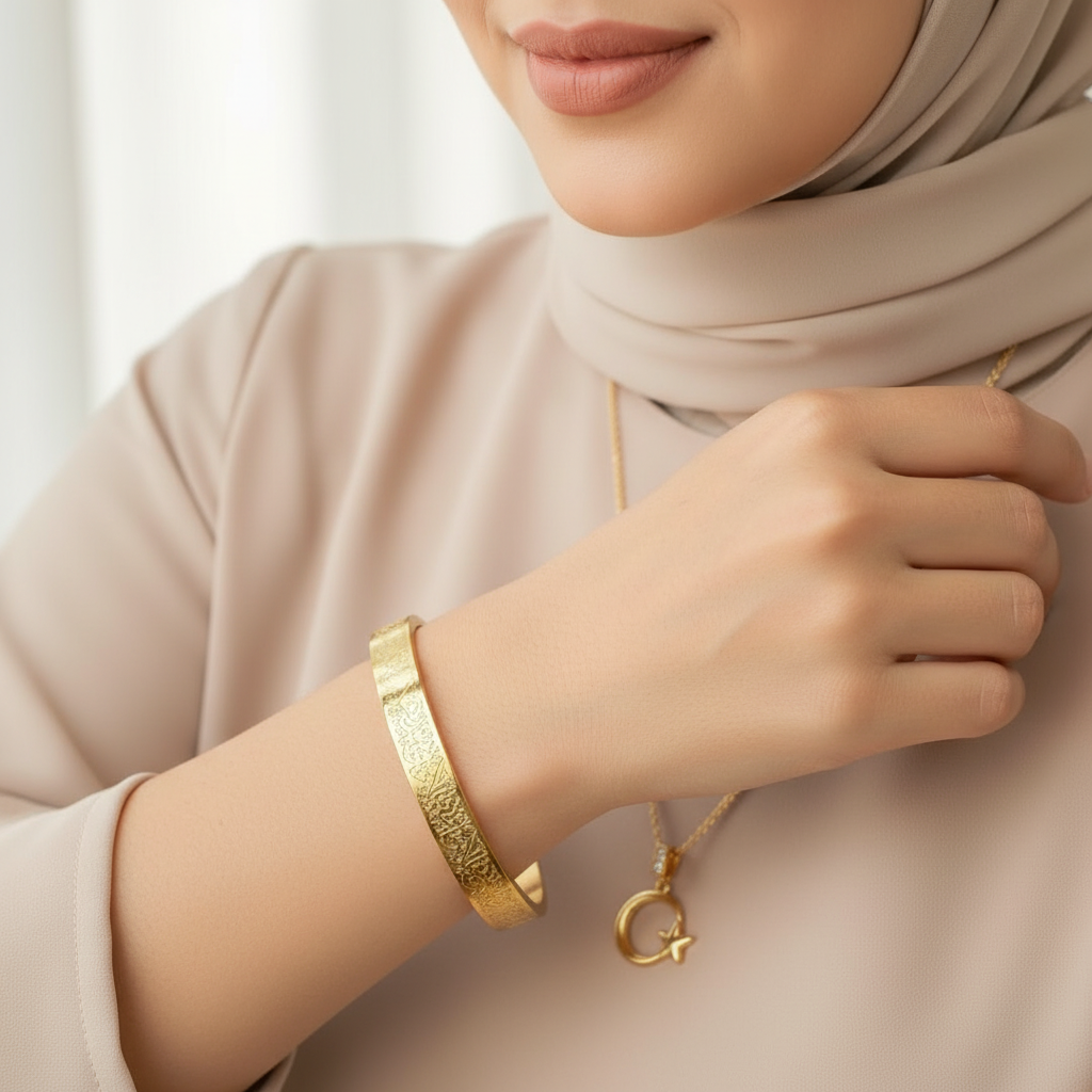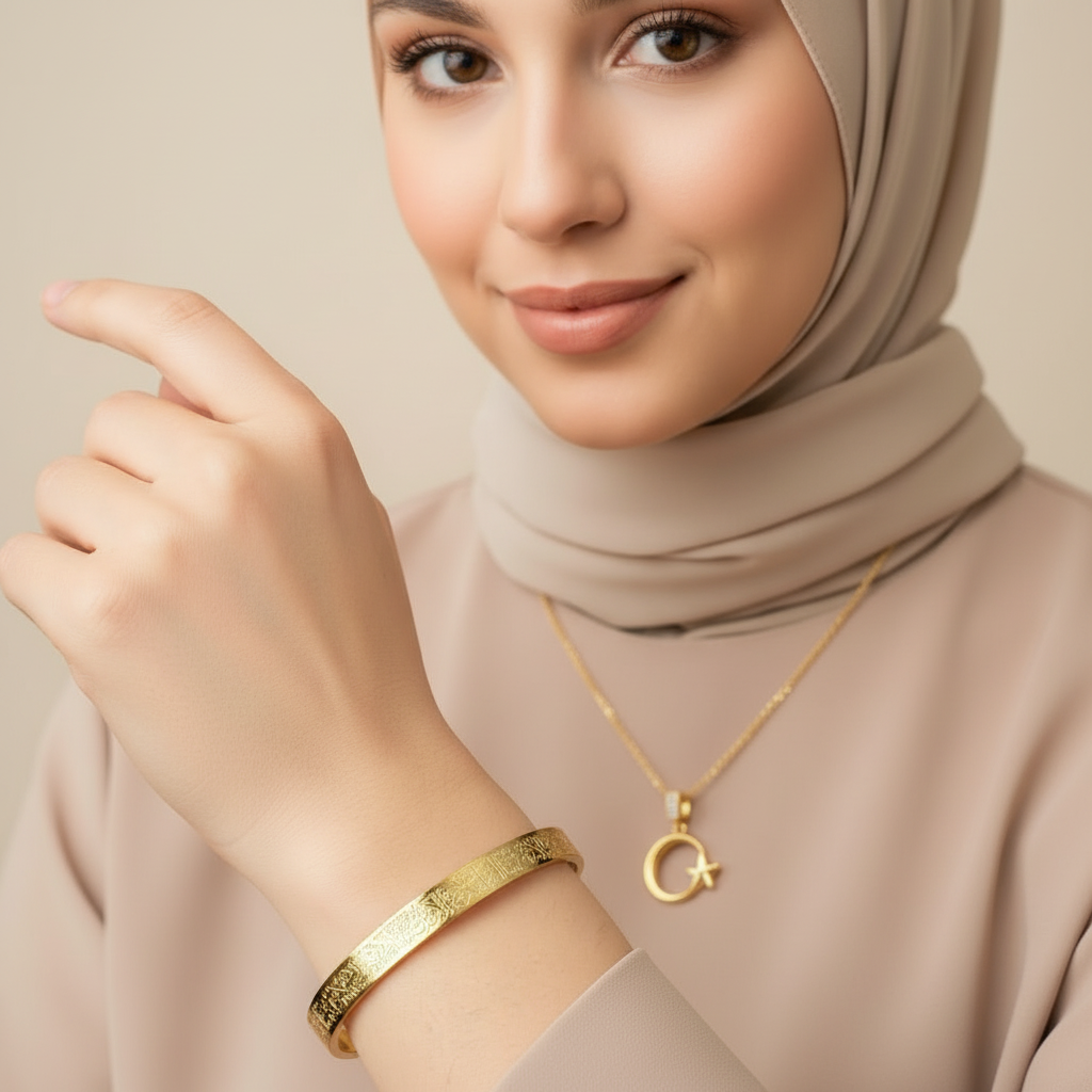 Türk bayrağı motifli kolye ve Ayetel Kürsi bileklikten oluşan bu set milli ve manevi değerleri bir araya getirir.